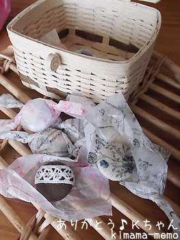先日、もう私には必要ないであろうマタニティの洋服を差し上げた友人Kちゃんから、お礼にと可愛らしいもの、美味しいものをいただいてしまいましたっ!