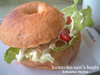 チーズをのせてトーストして、レタスとトマトをのせただけの貧相なベーグルサンドに変身させちゃいましたが…(;´Д`A ```