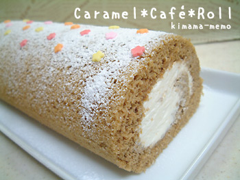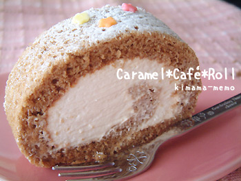 生地には、メープルシュガーやコーヒーが入っていて、スポンジにはキャラメルソースをふりかけてからクリームを巻いてます。