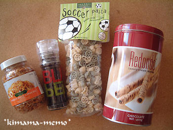 中にチョコの詰まったスティック状のクッキー缶、パスタ、ブラックペッパー、フライドオニオン。