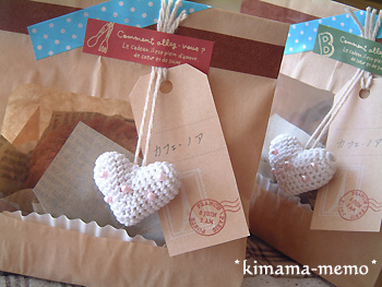 窓付きの袋に入れて、スタンプを押したタグとビーズのついたハートモチーフをぶら下げてみました。