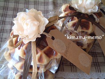ひとつずつ袋に入れて、ラフィアで束ねてお花飾りを付けてみました(^^)
