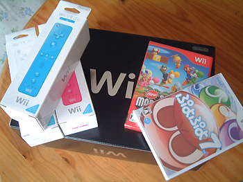 Wii(黒)と、リモコン3色、ぷよぷよ7、最新マリオ。