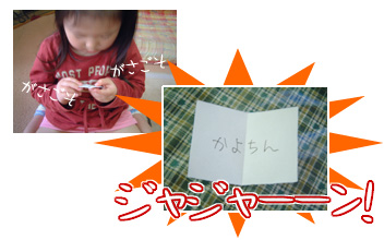 カッサカサの中から一枚引いて、開いて、「・・・・・か・よ・ち・ん?」と読んでくれました(笑)