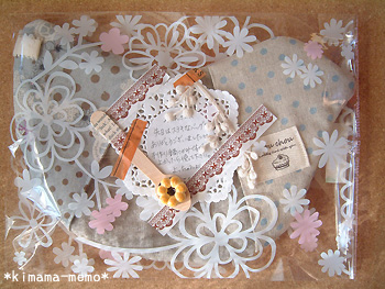 フランス語?をフリーハンドで書いたような柄の透明袋に入れてから、窓付きのクラフト袋に入れ、レースとリボンを飾ってみました(^^)