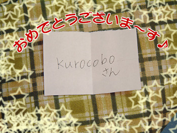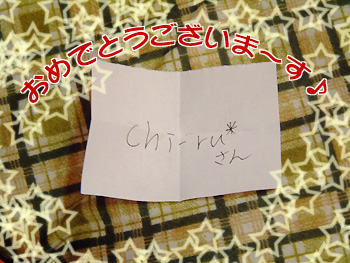 Chi-ru*さん、kurocoboさん、え~ちゃんさん(お引っ越しでご住所が変わってると思いますので)には、ご連絡先等を教えていただきたいので、左側にある管理人宛メールのフォームから、「・お名前・ご住所・お電話番号・メールアドレス」をご連絡くださいませ♪