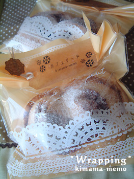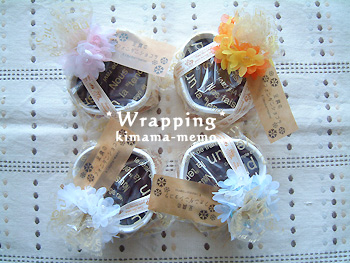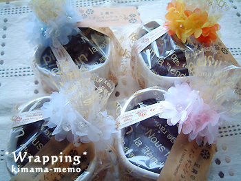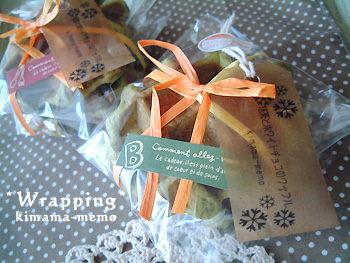 ひとつひとつシール付きの袋へ入れ、重ねてオレンジ色のラフィアで束ね、シールで留めました。
