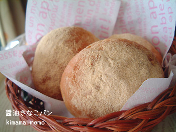 生地に醤油を混ぜ込んで、焼き上がりにバター醤油を塗り、きなこ砂糖をたっぷりかけた「醤油きなこパン」です。