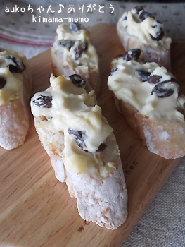 クリームチーズとラムレーズンを合わせたものをのせて、トーストしました(*≧m≦*)