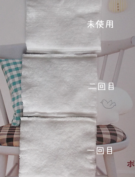 これは、上から「未使用コットン」「風呂上がりで使ったコットン」「初体験コットン」の順に並べてみました☆