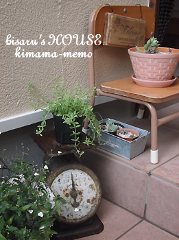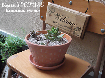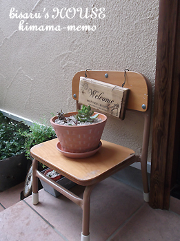 ちいちゃなイスの上には、多肉の寄せ植えとウエルカムボード。