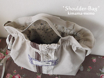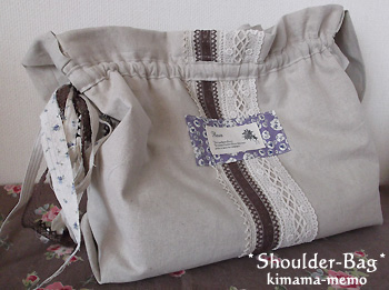 内布のハギレ、レース、リネンテープを通しています。