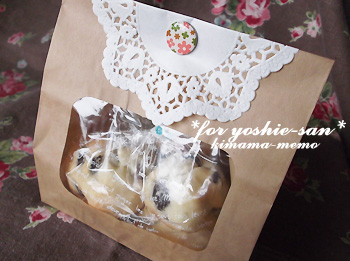 文字入りの透明袋に入れてから、窓付きの紙袋に入れて、紙レースとピンで留めました(^^)