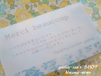 タグには、以前 yoshieさん からいただいたリバティのクロスシールを貼りました(^^)