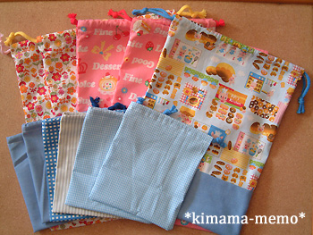 巾着(中サイズ)5枚と男の子向け巾着(小サイズ)6枚です。